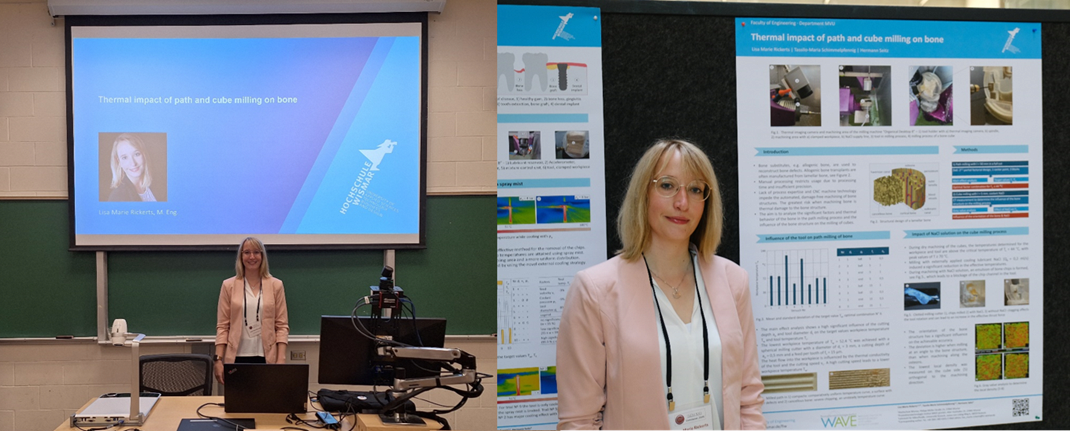 Zum Thema der CNC-Fräsbearbeitung von Knochenwerkstoff zur Herstellung allogener Implantate stellte Frau Lisa Marie Rickerts einen Teil der Forschungsergebnisse der vergangenen Jahre vor. Das Produktionstechnologie-Institut WAVE ergänzt die medizintechnischen Forschungsarbeiten der Hochschule Wismar in der Entwicklung neuartiger Implantatkonzepte und -strukturen. Ein Gebiet davon stellt die sterile und schadensfreie Fräsbearbeitung von Spenderknochen dar. Zur Verhinderung von thermischen Schäden in Folge der spanenden Bearbeitung wurden Konzepte basierend auf neuartigen Spültechnologien und Prozesstechniken entwickelt sowie wissenschaftlich evaluiert.